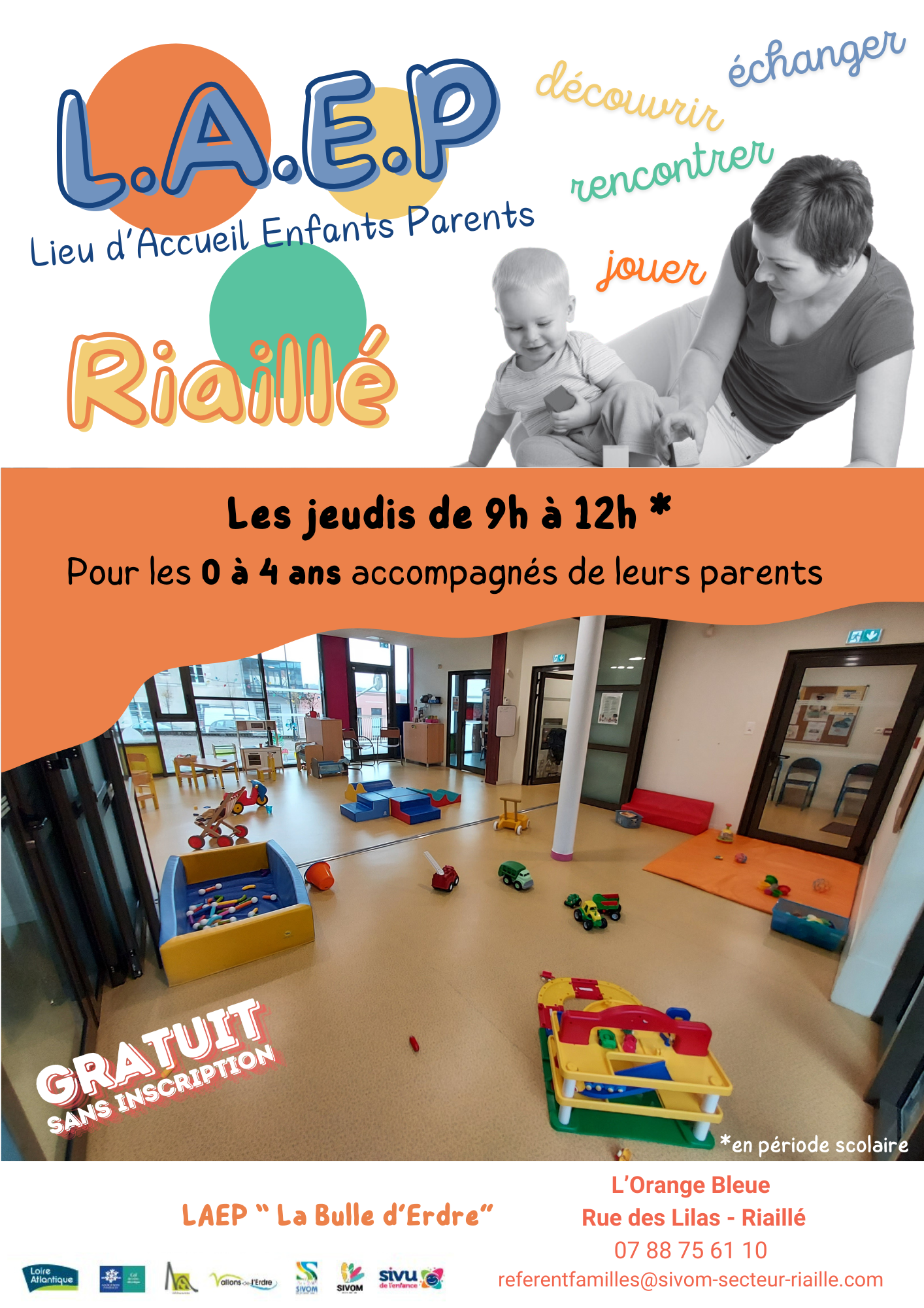 C'est la rentrée et l'équipe du Lieu d'Accueil Enfants Parents "La Bulle d'Erdre" vous attend à partir du jeudi 4 septembre de 9h à 12h à l'Orange Bleue à Riaillé !
