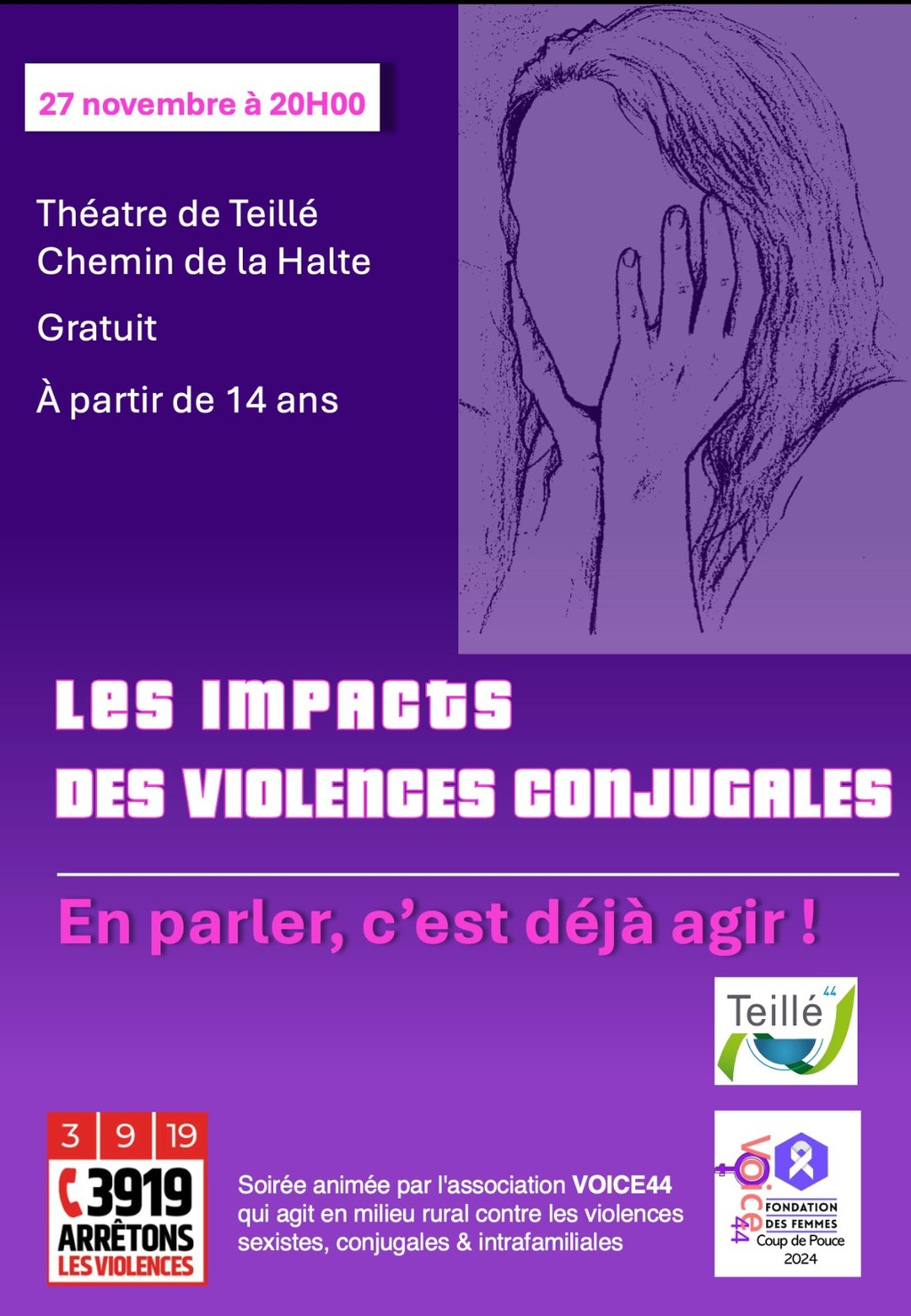 Dans le cadre de la campagne d’information contre les violences conjugales et intrafamiliales initiée par les élu.es de la commune de Teillé en partenariat avec l’association VOICE44, une soirée de sensibilisation est organisée (Tout public à partir de 14 ans).