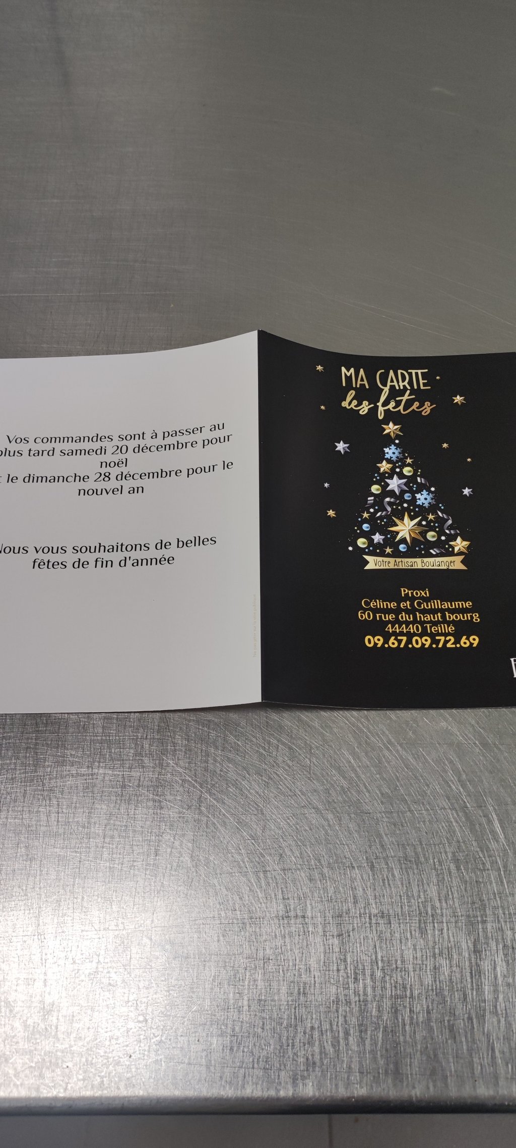 La carte des Fêtes est disponible au magasin Proxi, les commandes sont à passer au plus tard le samedi 20 Décembre pour Noël et le dimanche 28 Décembre pour le Nouvel An.