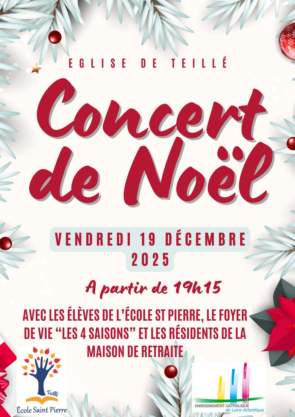 L'école St Pierre, les résidents de la Maison de retraite Sainte Famille ainsi que ceux du Foyer de vie Les 4 saisons vous invitent à leur concert de Noël le vendredi 19 décembre 2025 à 19h dans l'église de Teillé (début du concert à 19h15).