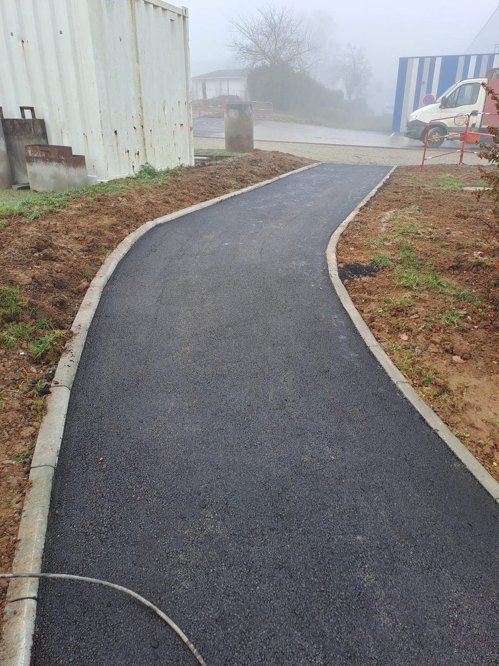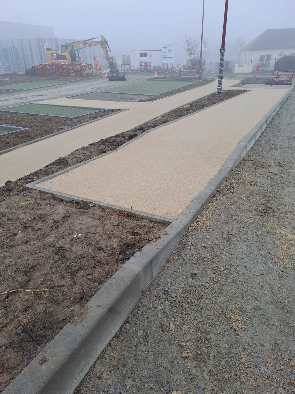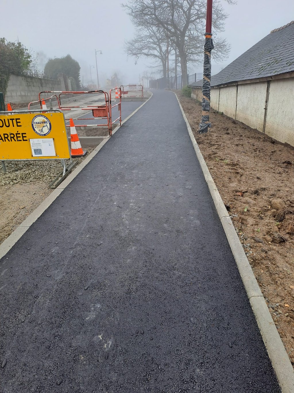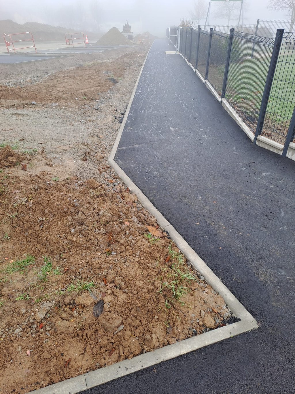 Comme vous pouvez le voir sur les photos, les cheminements piĂ©tons prennent forme avec la rĂ©alisation des enrobĂ©s, la pose des bordures et lâamĂ©nagement des accĂšs sĂ©curisĂ©s.