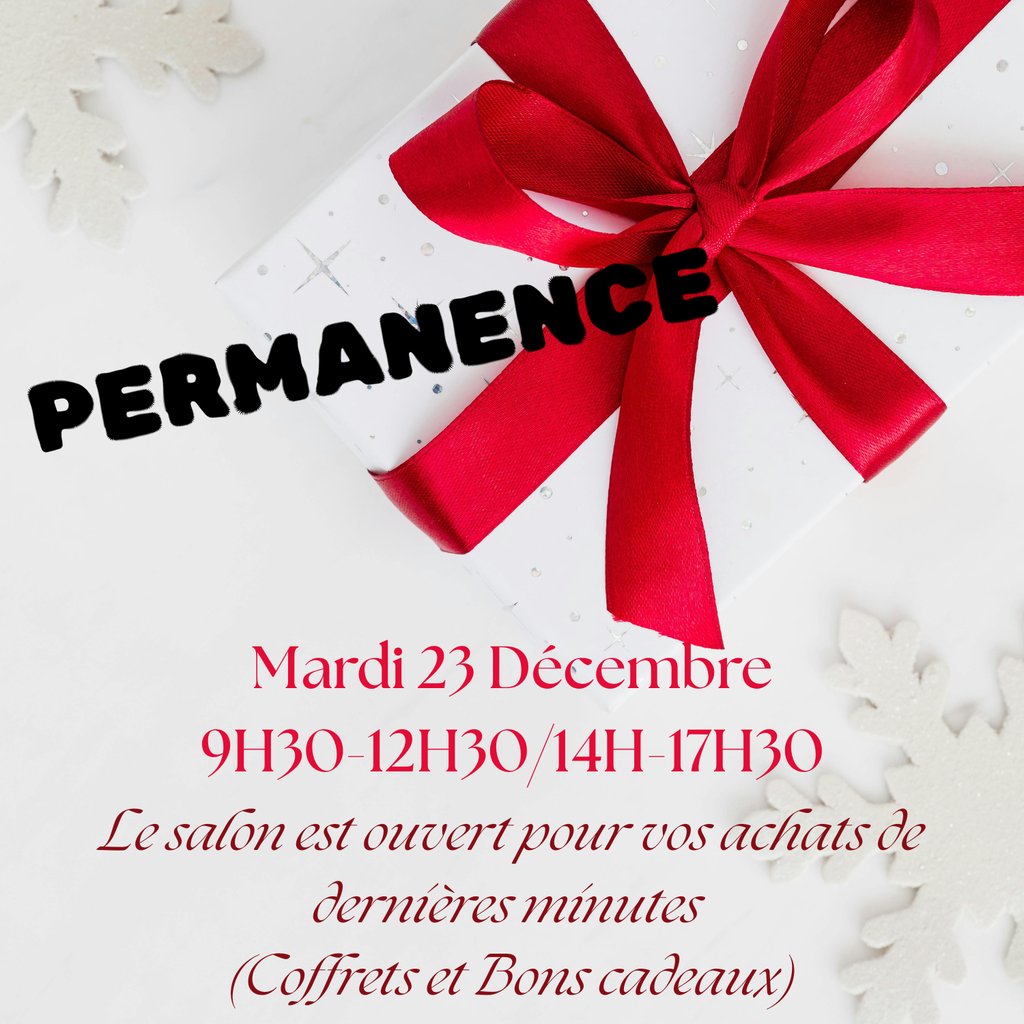 ET POUR LES RETARDATAIRES, LE SALON SERA OUVERT QUE POUR LES ACHATS DE CADEAUX OU BONS PHYSIQUES... MARDI 23 DÉCEMBRE DE 9H30-12H30 / 14H-17H30