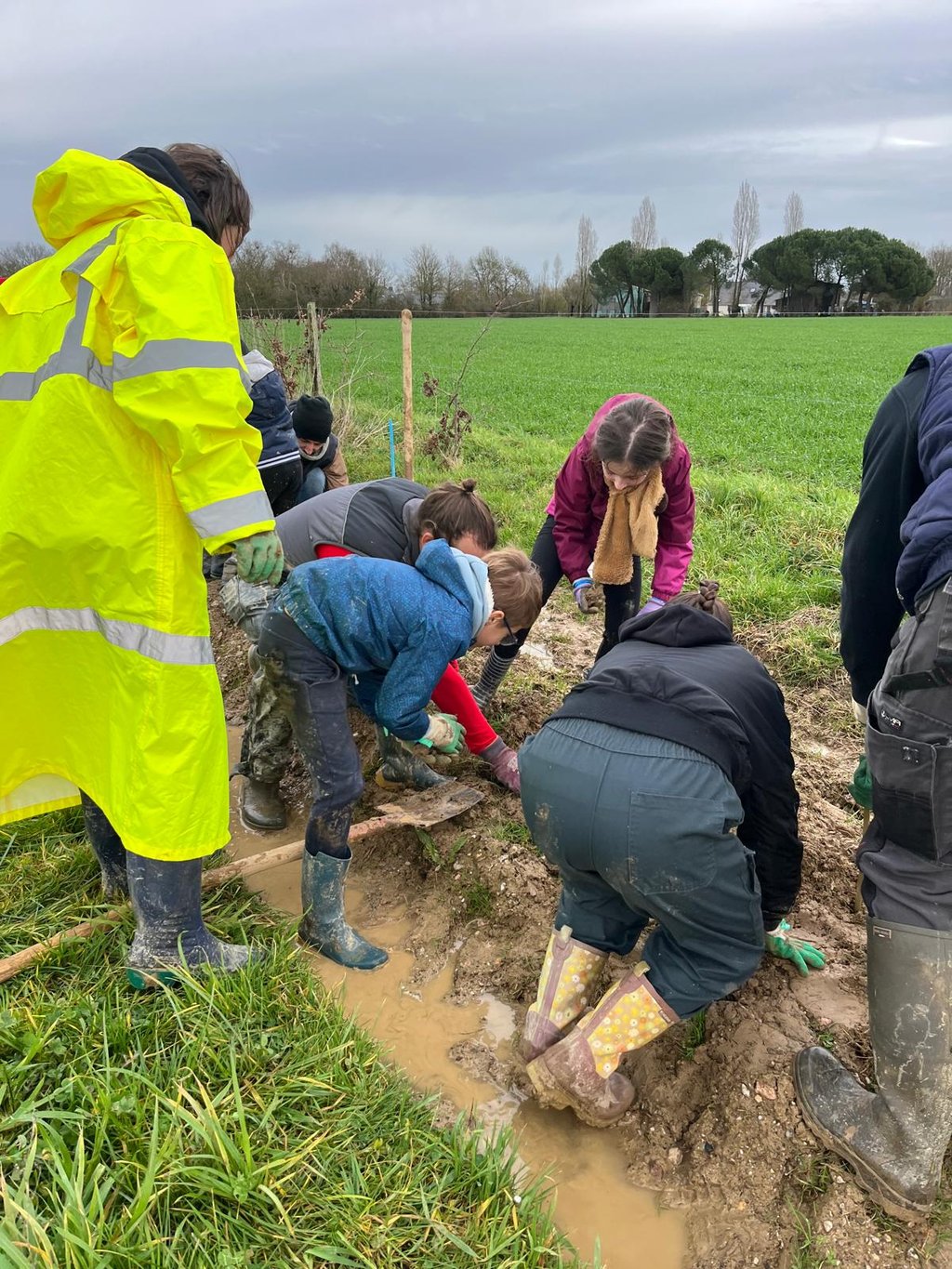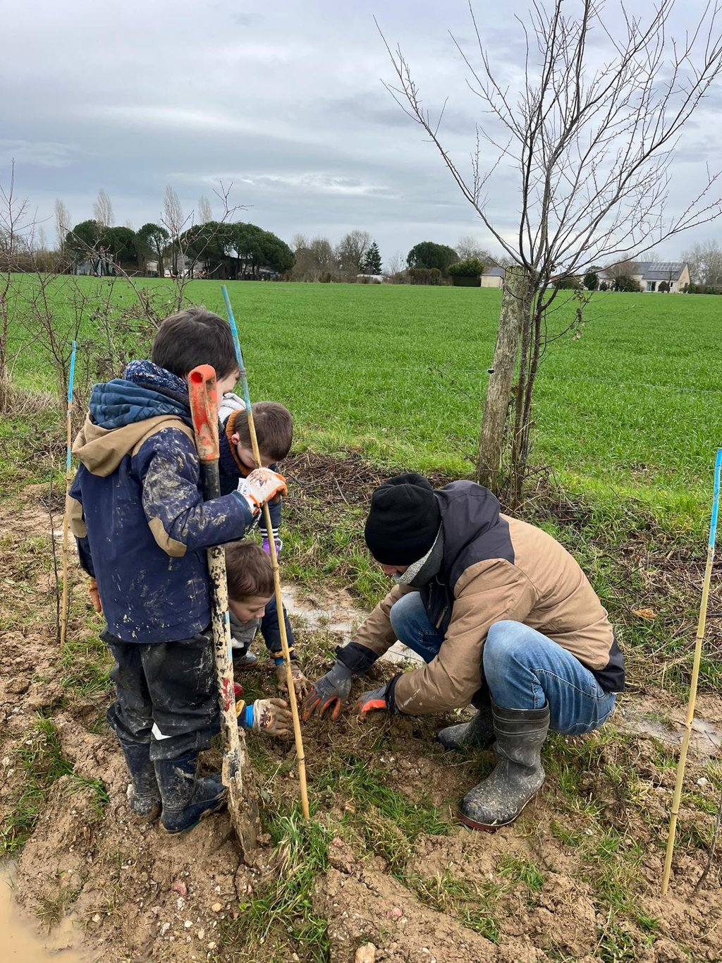 Le 5 février dernier, une joyeuse effervescence régnait sur l'exploitation bio de Quentin Huard. Accompagnés par l'association "Des Enfants et des Arbres" et "Sylvagraire", 19 élèves de CM1/CM2 et la classe de CE1/CE2 ont planté 350 arbres pour restaurer les haies bocagères de notre commune.