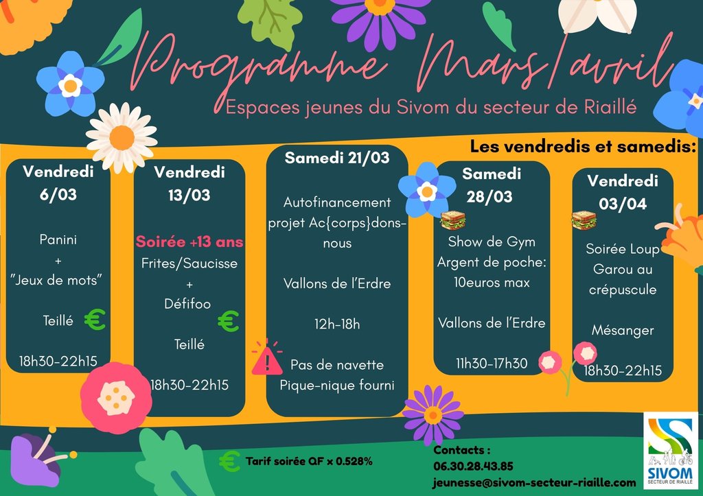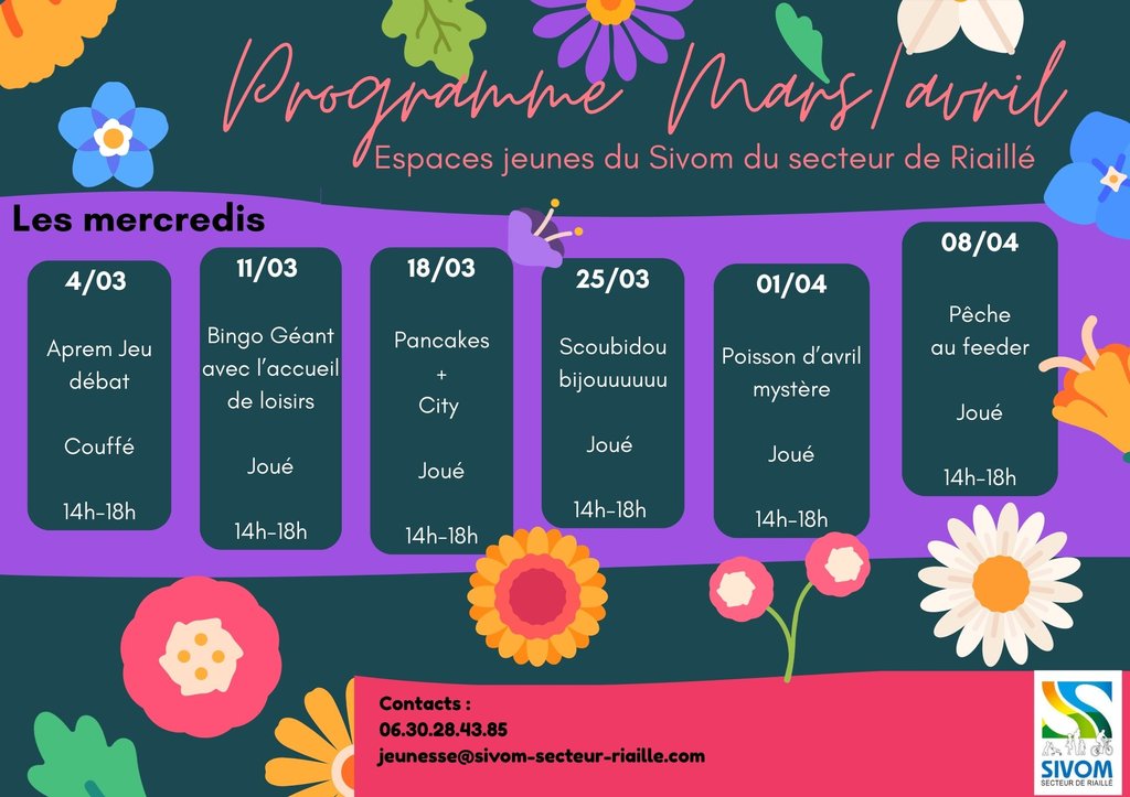 Voici les programmes des espaces jeunes du Sivom du secteur de Riaillé pour les mercredis, vendredis et samedis de mars/avril 2026!