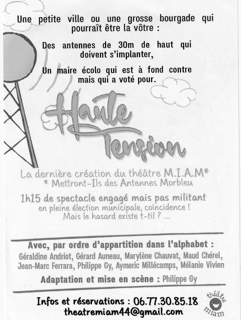 Un spectacle d'1h15 dans une ville qui pourrait être la vôtre : des antennes de 30 mètres de haut qui doivent s'implanter, un maire écolo à fond contre mais votant pour, un spectacle sous haute tension ⚡