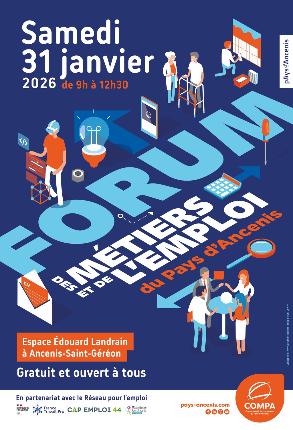 Le Forum des métiers et de l’emploi du Pays d’Ancenis revient en 2026 : le vendredi 30 janvier (journée réservée aux établissements scolaires du Pays d’Ancenis) et le samedi 31 janvier (matinée grand public), espace Édouard Landrain, à Ancenis-Saint-Géréon.