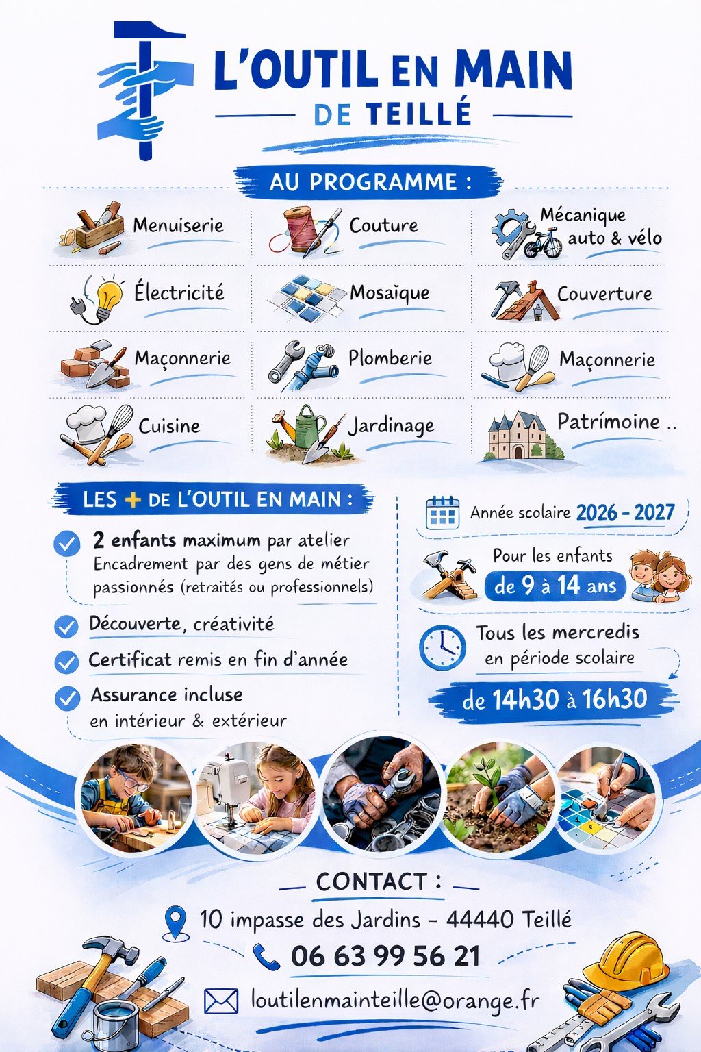 L’Outil En Main Teillé a pour concept d’initier les jeunes de 9 à 14 ans aux métiers manuels et du patrimoine. Avec dix principes fondamentaux : les initier à la connaissance, développer leur dextérité, élaborer et réaliser un bel ouvrage, découvrir et travailler la matière, le respect, les sensibiliser au patrimoine, le vivre ensemble, susciter des vocations, maintenir un lien intergénérationnel et prendre confiance en soi.